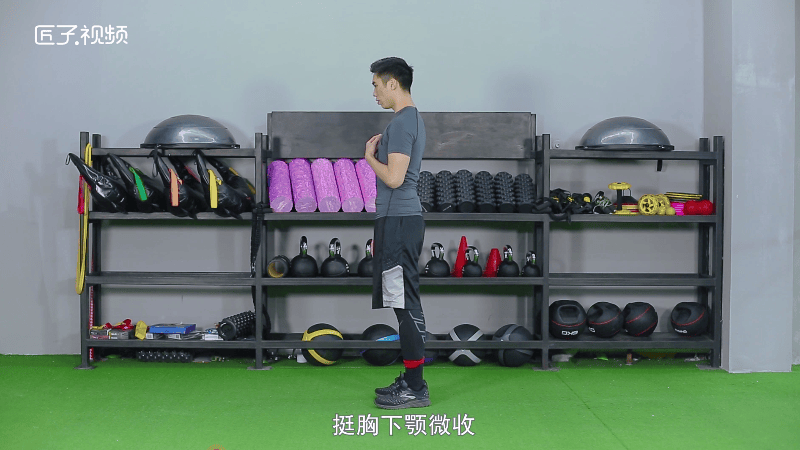 1、双腿自然分开,腹部收紧,挺胸下颚微收;