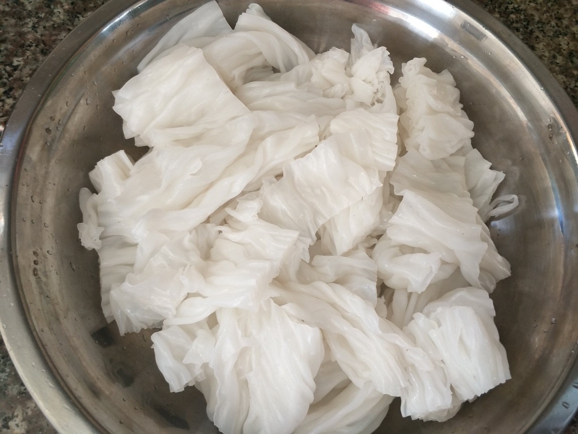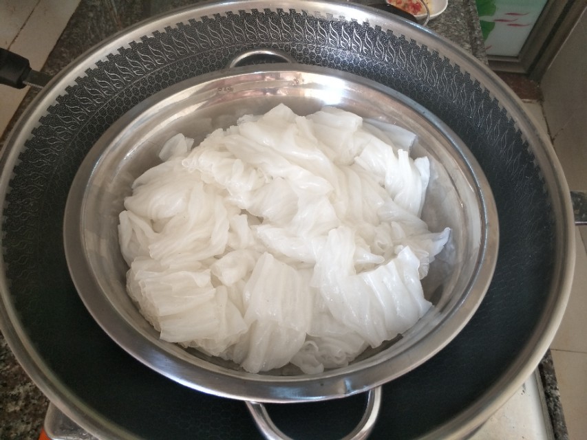 现买的两块钱皱切粉,(在我们这边就是叫皱切粉,因为它皱皱的,又是切好的,所以就叫皱切粉),放入盆中,隔水蒸热就可以。