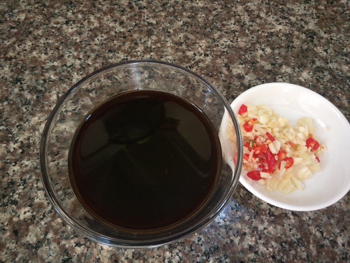 准备蒜末,小米椒切成圈备用。再来个碗调个料汁,碗中放入剁好的酸梅酱,加入两勺生抽,一勺蚝油,加入半碗清水调匀备用(因为本身酸梅酱是酸咸的,所以就不用放盐了)。