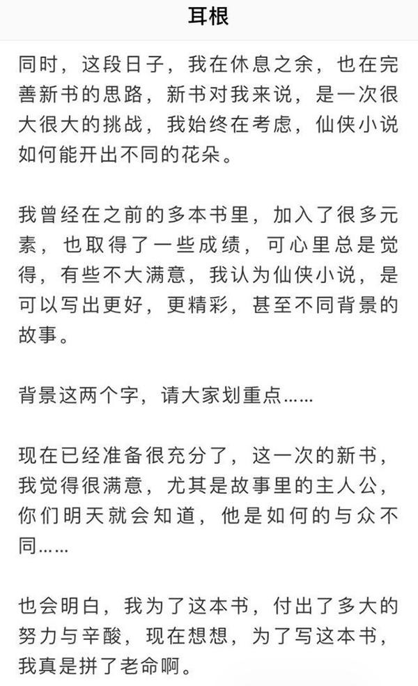 5月29日,耳根在微信公众号发布了新书书名《三寸人间》和开篇语“写在连载前”。