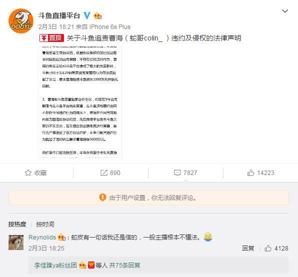 前任东家斗鱼发布了公告,对于蛇哥这件恶意抹黑以及违约事件采取法律措施。