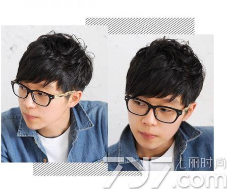 斜刘海男生发型配合黑色发色,给人一种很沉稳的感觉,再将头顶的短发进行烫卷,那样会让造型更加时尚有范儿,戴上眼镜很有校园文艺范儿。