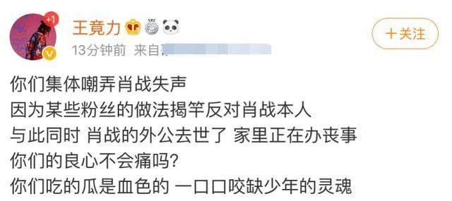 有的网友责怪肖战在这次事件中没有站出来阻止粉丝胡闹,就在今天一个选秀艺人王竟力在微博中说到“肖战的外公去世了,家里正在办丧事……”疑发声来力挺深陷舆论漩涡中的肖战。但是没多久,王竟力就删除了这条微博,但是还是被手快的网友截图保存下来了。