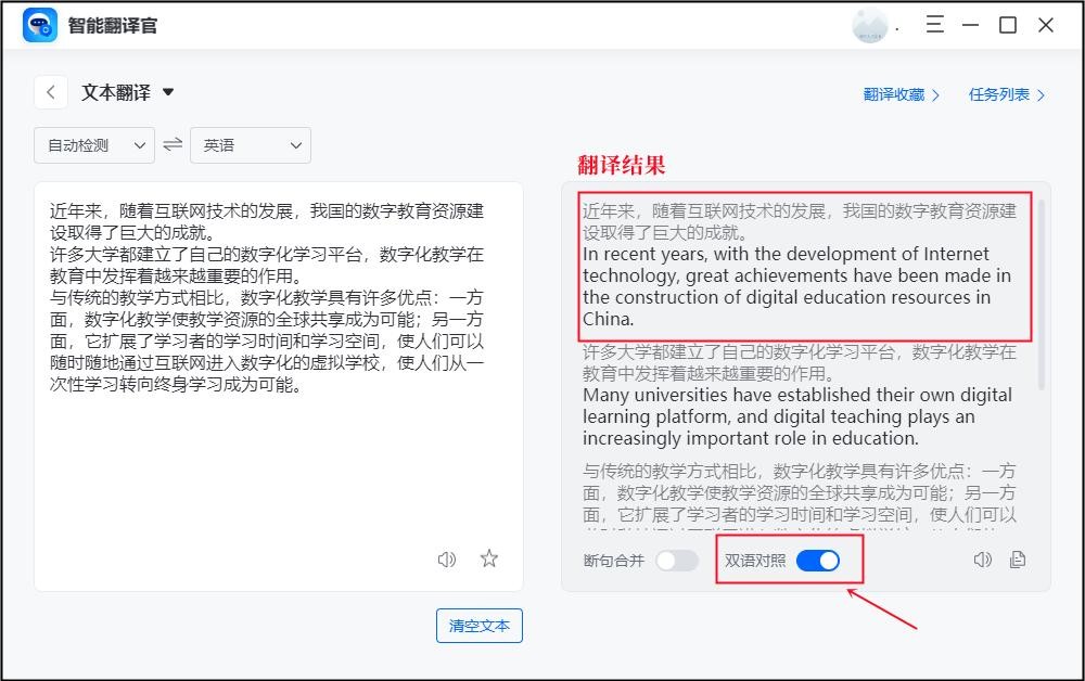 接下来就可以在页面左侧的空白处输入需要翻译的文本了,翻译结果会出现在右侧的对话框中哦,开启【双语对照】就可以查看每一句话对应的翻译结果啦。