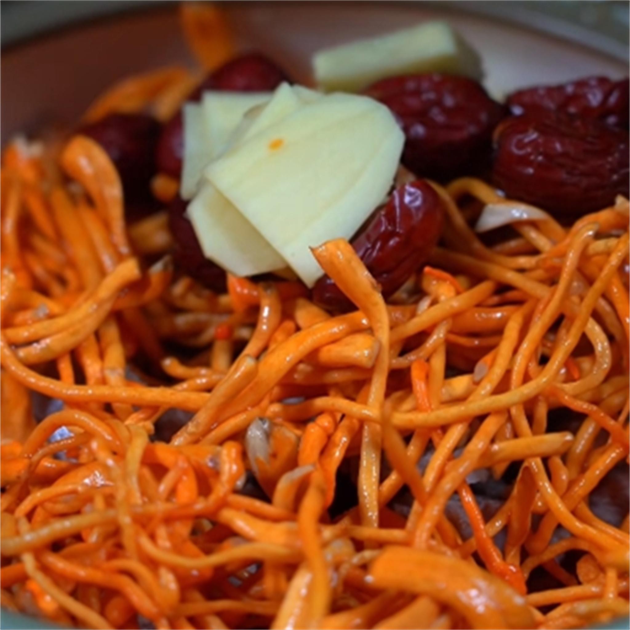 3. 炖煮:将排骨、生虫草花、红枣、生姜放入炖锅中,加入适量的水,没过食材。