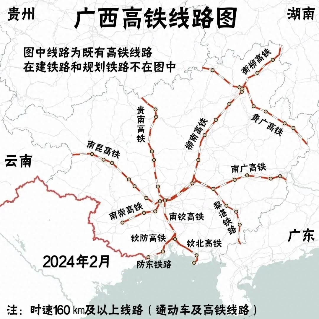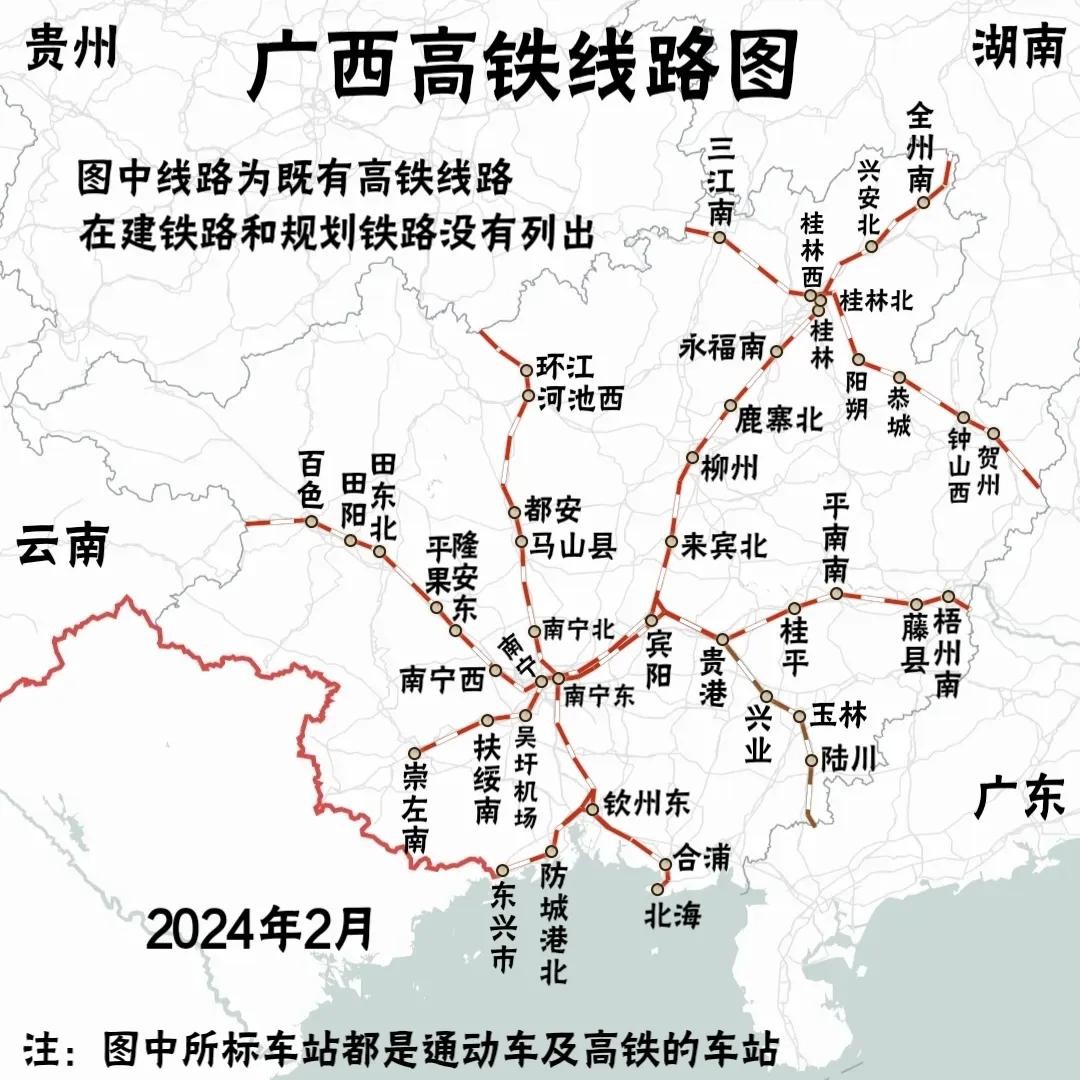 截止到2024年2月,广西通动车及高铁的火车站有44个,通动车及高铁的线路有12条,与广西接壤的省份有4个,广西临海、临界,广西14个地级市已经实现市市通动车。