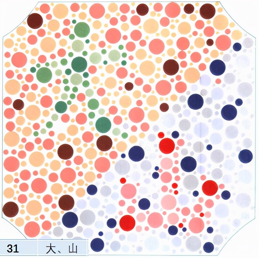在第1幅图中大家可以看到有两个汉字,第1个汉字是大,第2个汉字是山。如果大家没有办法识别出来汉字大,那么就是绿色色弱或者色盲,如果没有办法识别出来汉字山那么就是红色色弱。