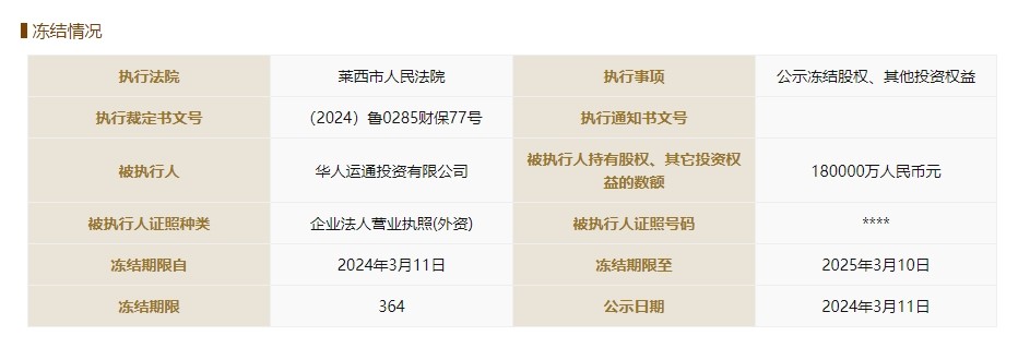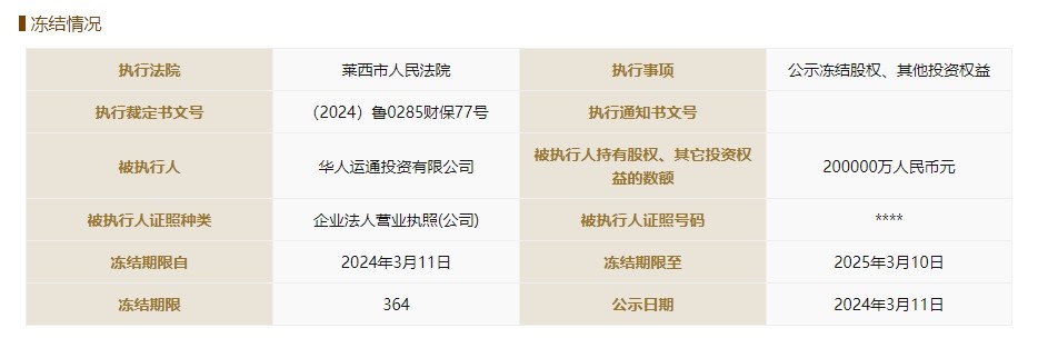 中新经纬3月25日电 据国家企业信用信息公示系统网站信息,华人运通投资有限公司(以下称“华人运通投资公司”)新增一则股权冻结信息,其所持超38亿股权被冻结。