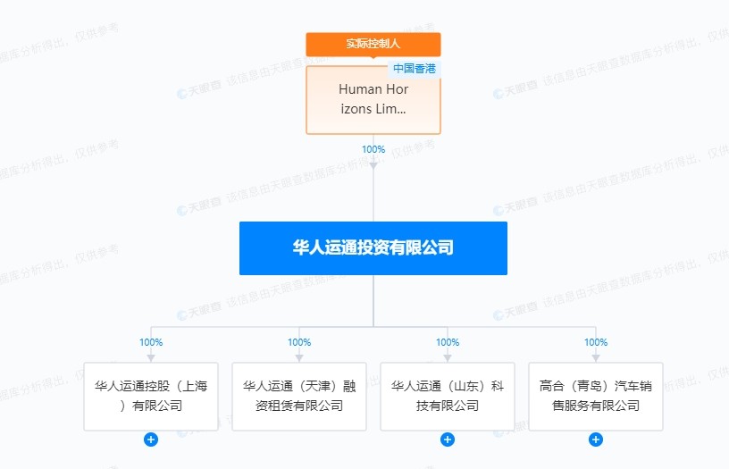 天眼查“股权信息”显示,华人运通投资公司成立于2022年,是一家以从事汽车制造业为主的企业,持有华人运通控股(上海)有限公司、高合(青岛)汽车销售服务有限公司等4公司100%股权。该公司由Human Horizons Limited全资持股。
