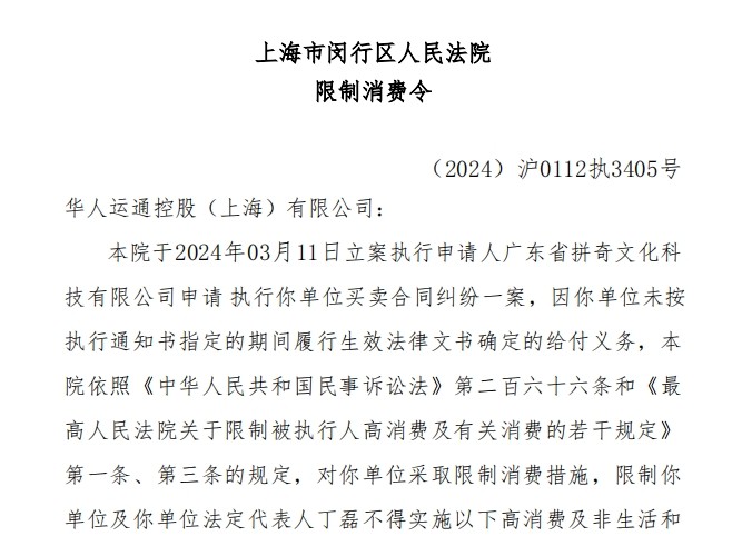 另据中国执行信息公开网,2024年3月8日,华人运通投资公司被上海市闵行区人民法院执行19.71万。同时,3月21日,上海市闵行区人民法院对华人运通控股(上海)有限公司及法定代表人丁磊发布限制消费令。
