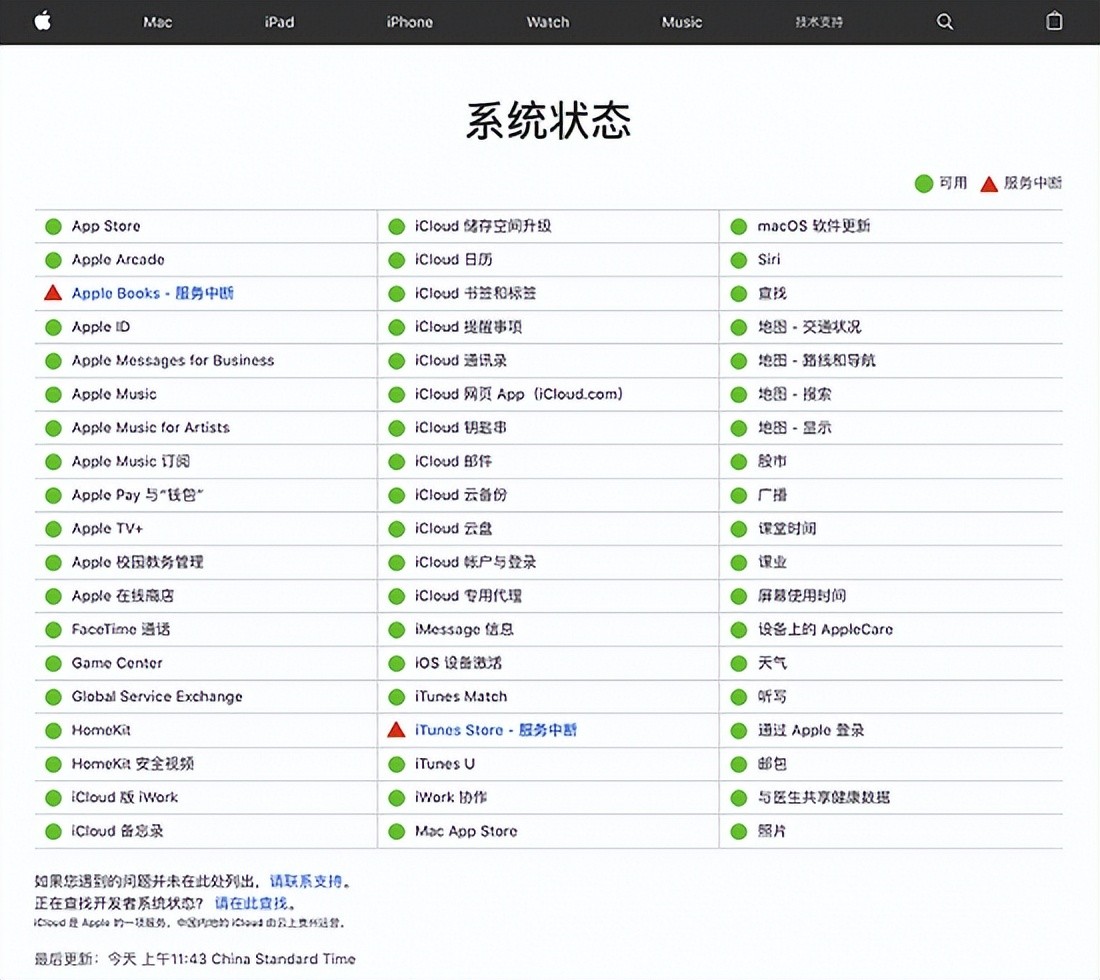 苹果公司系统状态页面显示,截至目前,iTunes Store、Apple Books均处于服务中断状态。