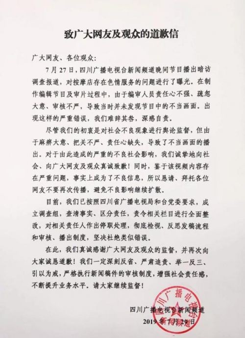 7月29日晚,四川广播电视台发布致广大网友及观众的道歉信。信中称,由于编审人员责任心不强、疏忽大意,审核不严,导致当时并未发现节目中的不当画面。出现这样的严重错误,我们难辞其咎,深感自责。对相关责任人作出停职处理。