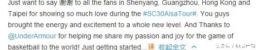 短短几天的中国行,即将离开时,库里在自己的中国的微博上发表自己的心情:“只想说谢谢所有的球迷在沈阳、广州、香港和台北让那么多爱在。你们带来的能量和兴奋,一个全新的水平。我的激情和快乐篮球的游戏世界!刚刚开始……”
