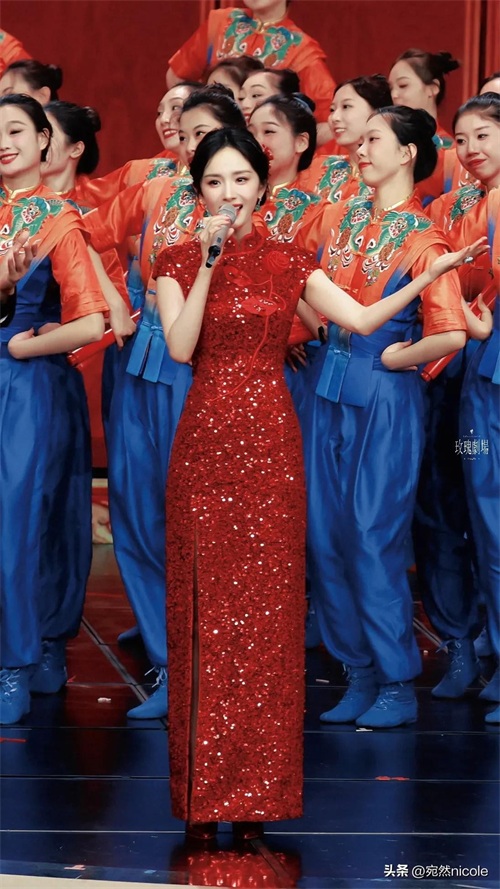 杨幂身着这身旗袍,完美地展现了她的身材优势。旗袍的贴身设计让她凹凸有致的身材一览无余,优美的曲线让人眼前一亮。让她在舞台上更加耀眼夺目。#央视春晚##杨幂##天南地北大拜年#