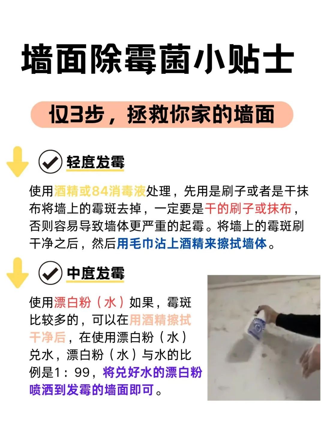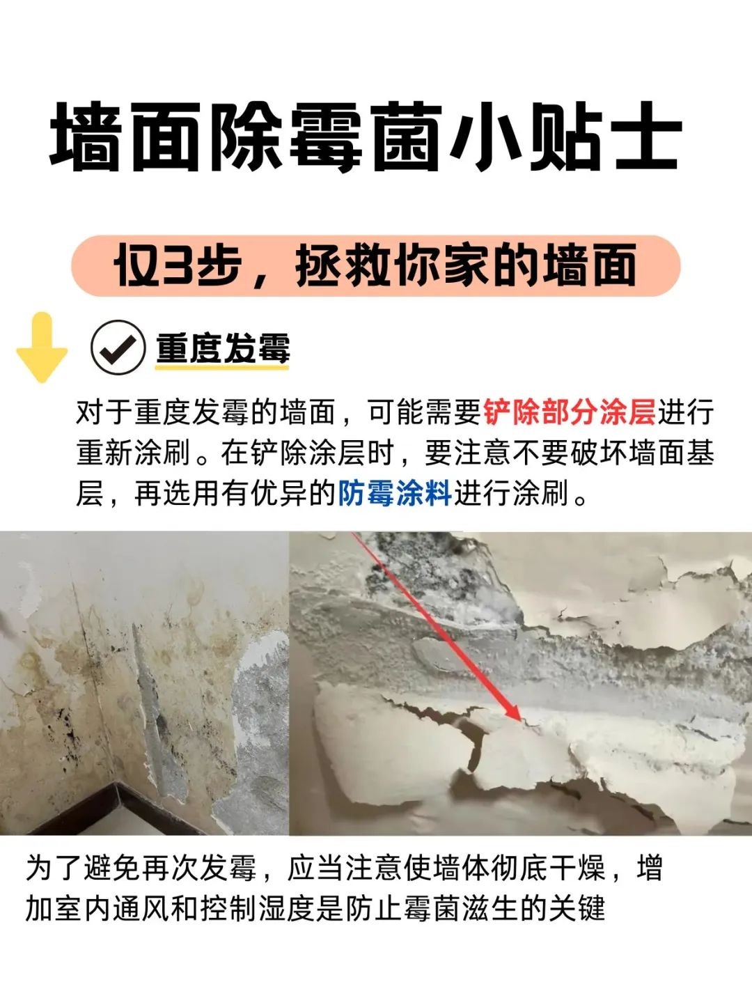 小贴士:为了避免墙面再次发霉,保持墙体彻底干燥是关键!增加室内通风,控制室内湿度,都是防止霉菌滋生的有效方法。