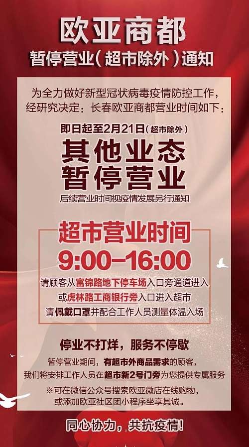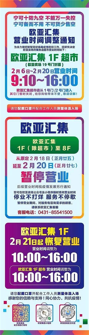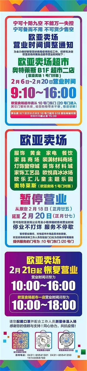 长春欧亚卖场、欧亚商都、欧亚各门店、卓展营业时间调整