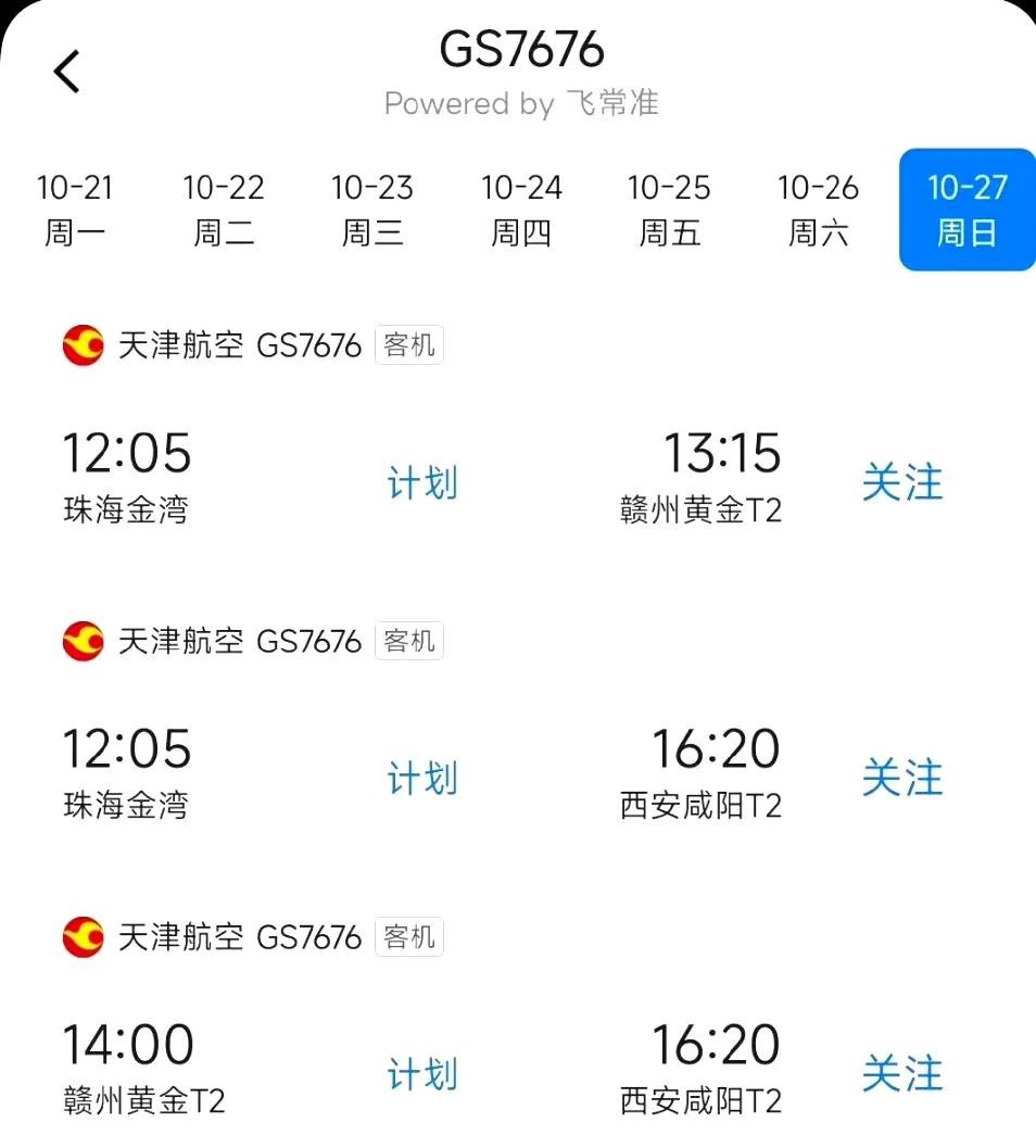 10月27日起,冬春航季开启。天津航空将继续执行西安咸阳经停赣州黄金,往返珠海金湾航线。航班号:GS7675/6 周期:每日一班,机型由ERJ195换成空客A320,航班时刻如下图,↓