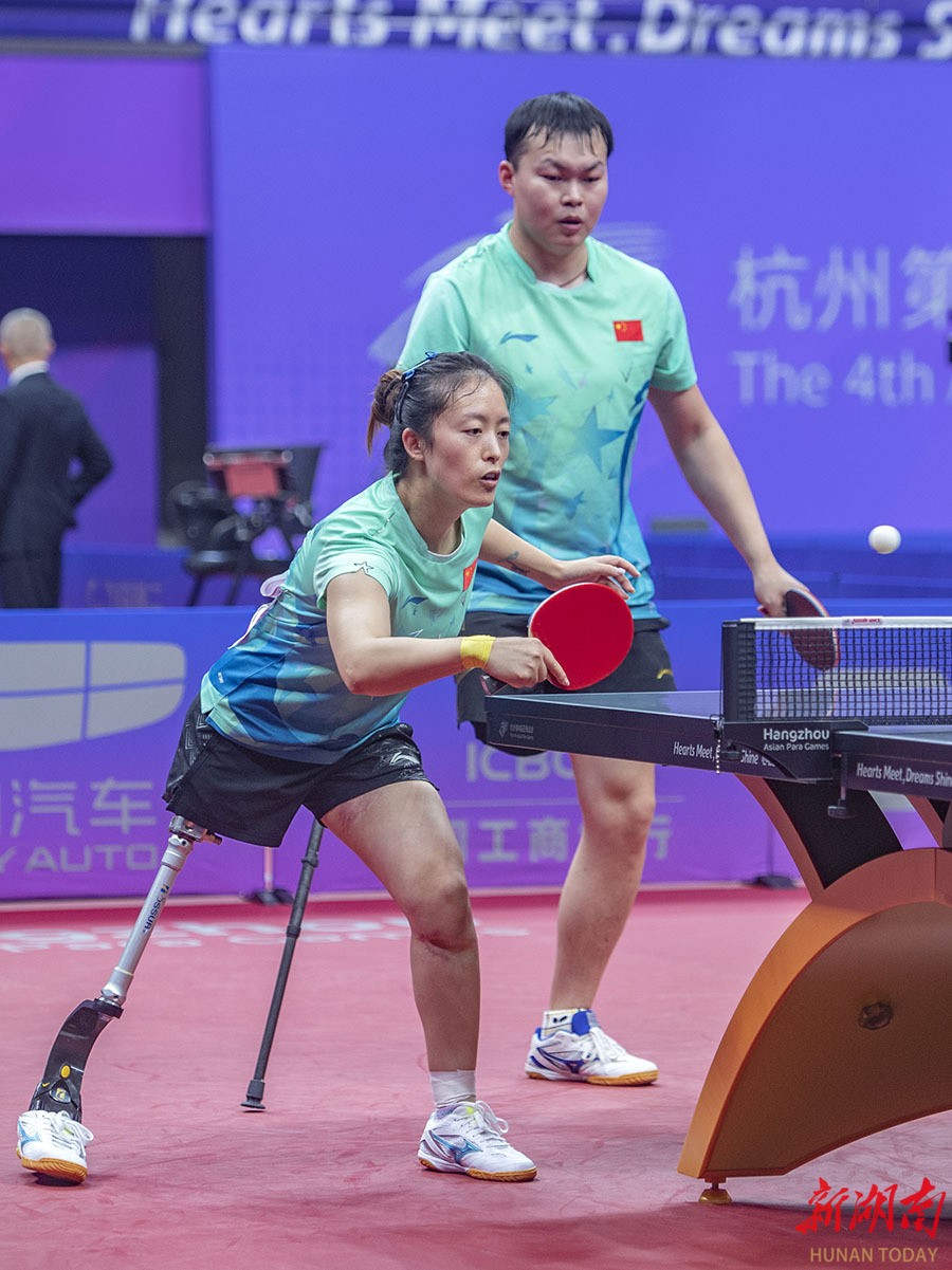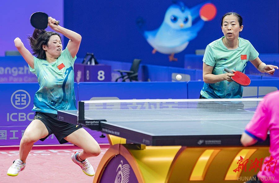 10月27日,杭州拱墅运河体育公园体育馆,乒乓球女子双打WD20决赛中,中国组合赵小静(左)、熊桂艳以3比2战胜中国台北组合林姿妤、田晓雯,获得金牌。 湖南日报全媒体记者 李健 摄