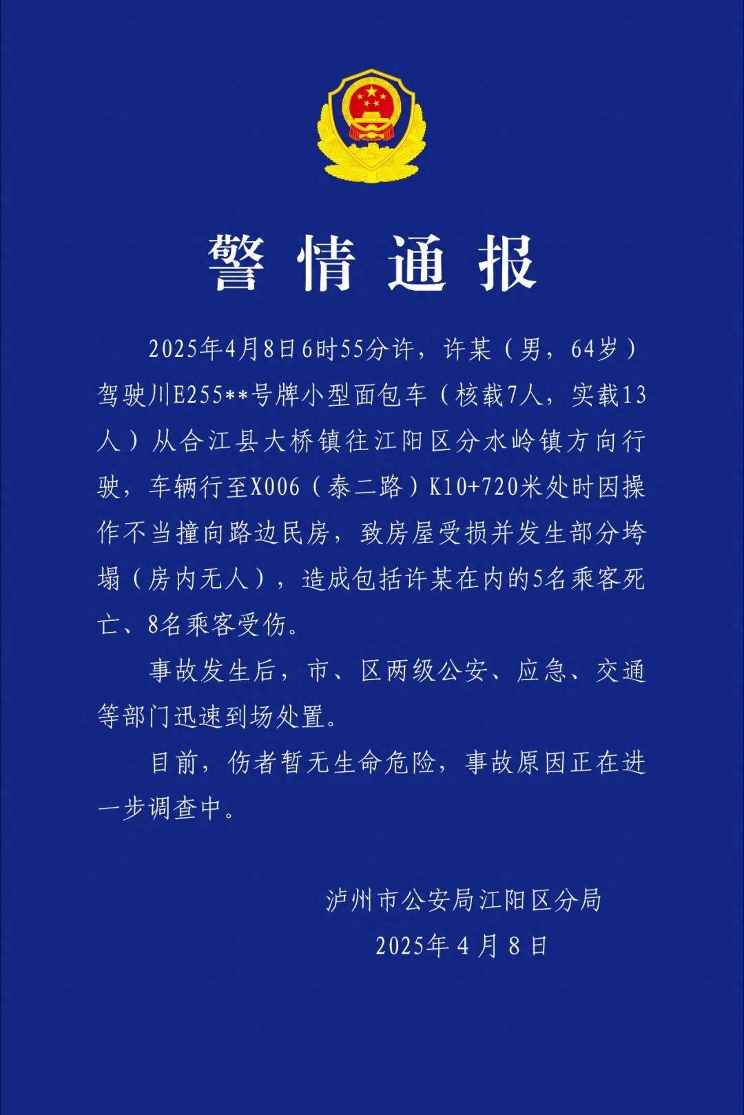 2025年4月8日6时55分许,许某(男,64岁)驾驶川E255**号牌小型面包车(核载7人,实载13人)从合江县大桥镇往江阳区分水岭镇方向行驶,车辆行至X006 (泰二路)K10+720米处时因操作不当撞向路边民房,致房屋受损并发生部分垮塌(房内无人),造成包括许某在内的5名乘客死亡、8名乘客受伤。