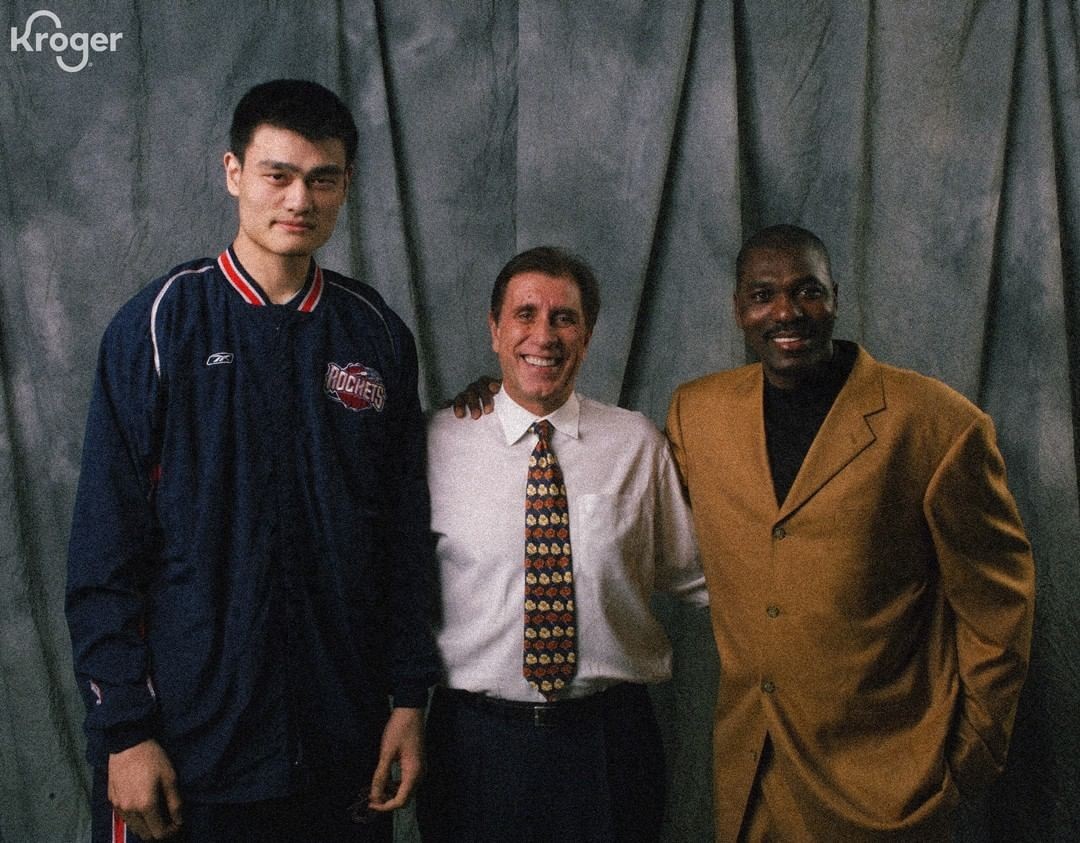 火箭官方晒姚明、奥拉朱旺与汤姆贾诺维奇合影:团队
