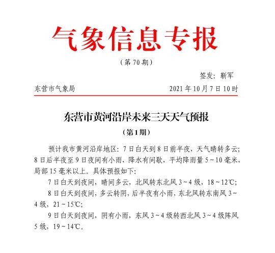 预计东营市黄河沿岸地区:7日白天到8日前半夜,天气晴转多云;8日后半夜至9日夜间有小雨,降水有间歇,平均降雨量5~10毫米,局部15毫米以上。具体预报如下: