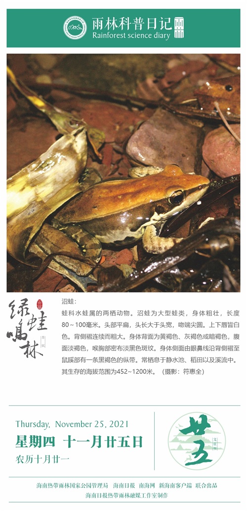 沼蛙:蛙科水蛙属的两栖动物。沼蛙为大型蛙类,身体粗壮,长度80至100毫米。头部平扁,头长大于头宽,吻端尖圆。上下唇皆白色。背侧褶连续而粗大。身体背面为黄褐色、灰褐色或暗褐色,腹面淡褐色,喉胸部密布淡黑色斑纹。身体侧面由眼鼻线沿背侧裙至鼠蹊部有一条黑褐色的纵带。常栖息于静水池、稻田以及溪流中。其生存的海拔范围为452至1200米。(摄影:符惠全)