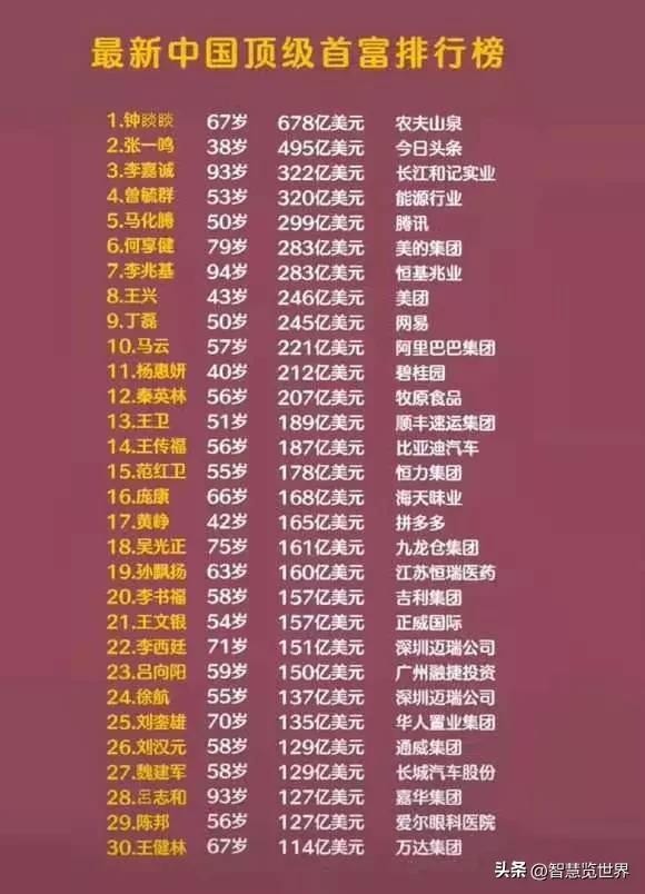 近日出炉最新的中国富豪排行榜前30名,农夫山泉的钟睒睒以678亿美元财富登顶第一,头条领头人张一鸣排第2,仅38岁榜上最年轻!93岁的李嘉诚322亿第三。马化腾299亿第5。淘宝的马云221亿第10。王健林114亿掉到第30名。