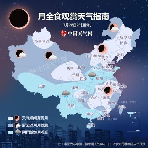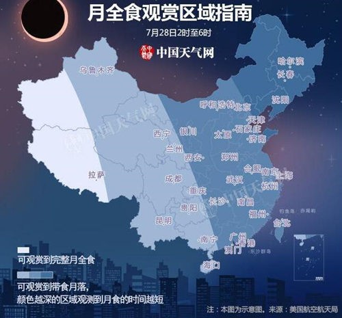 我国月全食观赏区域和天气如何?请看下图: