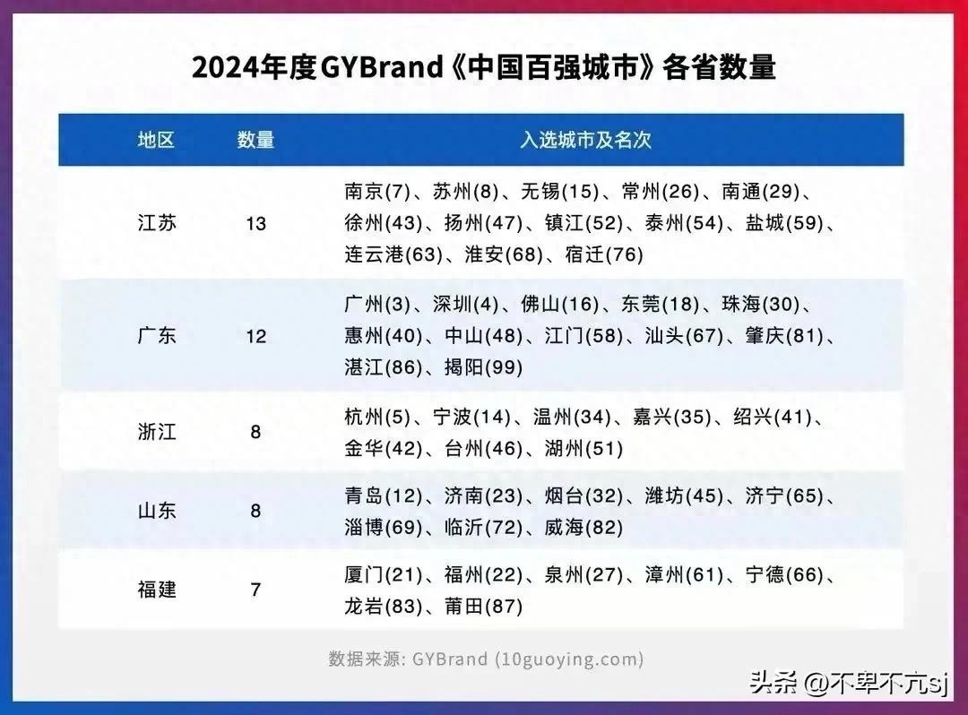 2024年最新中国百强城市各省数量排名,江苏13太保全部上榜