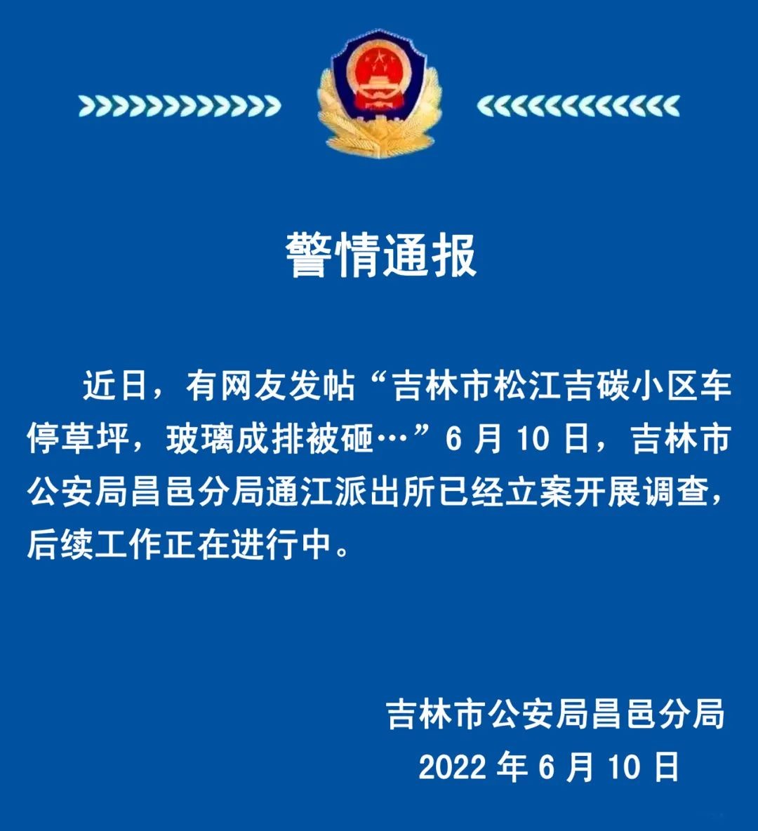 吉林警方通报“吉林市松江吉碳小区车停草坪,玻璃成排被砸”