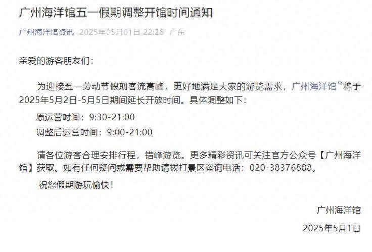 5月1日,广州海洋馆发布通知,为迎接五一劳动节假期客流高峰,更好地满足大家的游览需求,广州海洋馆将于2025年5月2日-5月5日期间延长开放时间。原运营时间:9:30-21:00,调整后运营时间:9:00-21:00。