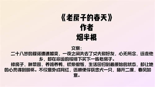 推荐一本现言,《老房子的春天》by烟半根,属于种田文。