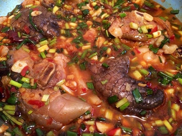用料:鳄鱼肉1斤,葱姜蒜,八角,花椒几颗,陈皮三根,豆瓣,干辣椒,啤酒,冰糖。