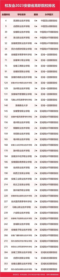 以下是2023年安徽省高职院校排名其中排在第一位的是芜湖职业技术学院,第二位是合肥职业技术学院,安徽职业技术学院。