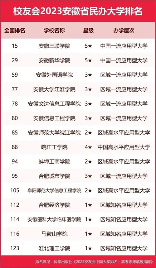 以下是2023年安徽省民办大学排名,其中排在第一位的是安徽三联大学,第二位是安徽新华学院,第三位是安徽外国语学院。
