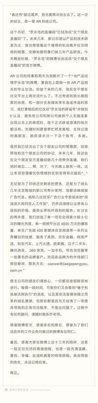 罗永浩发长文告别社交平台:未来仍会直播带货