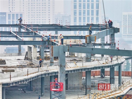 2月25日,位于武汉王家墩中央商务区核心地段的武汉图书馆新馆项目建设正酣。记者在现场看到,独特的三面流线型结构已现雏形,工程人员正在大跨度钢结构上作业。