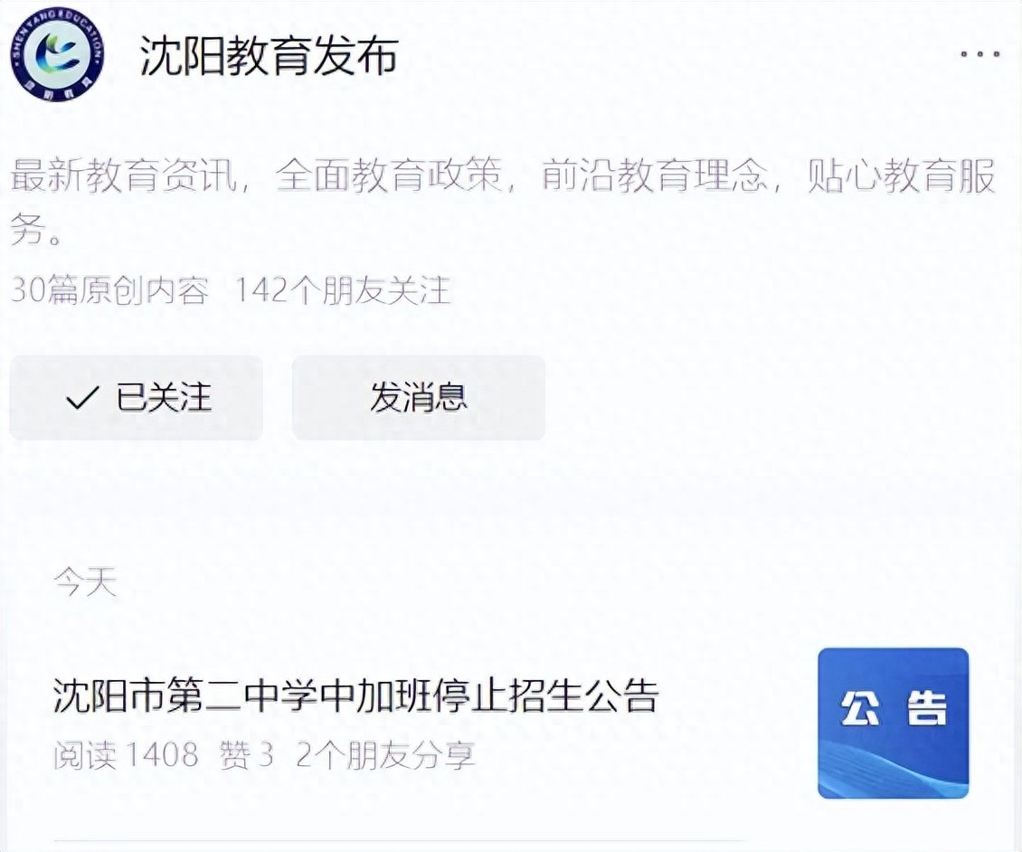刚刚,沈阳市教育局发布!沈阳市第二中学中加班停止招生公告!