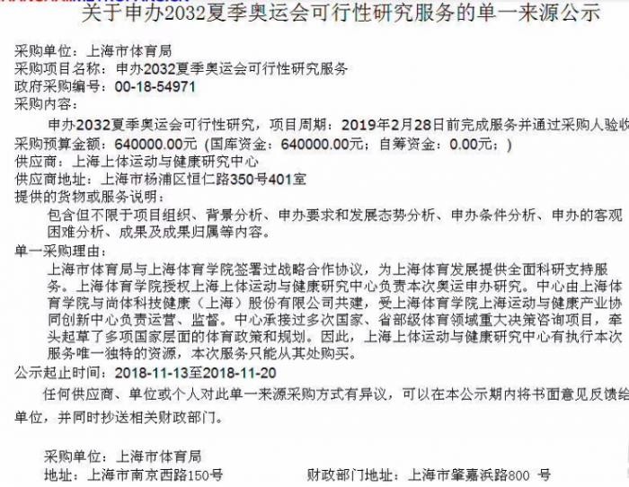11月13日,上海政府采购网发布了《关于申办2032夏季奥运会可行性研究服务的单一来源公示》,表示上海市体育局正对申办2032夏季奥运会进行可行性研究分析的招标。似乎印证了此前上海可能要举办奥运会的传闻。
