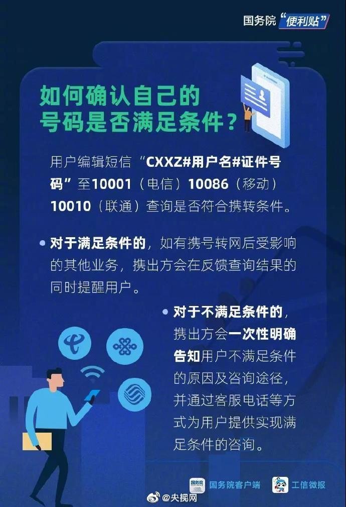10日开始,携号转网服务试运行。①编辑短信“CXXZ#姓名#证件号码”至当前运营商(移动10086,电信10001,联通10010),看是否符合条件;②编辑“SQXZ#姓名#证件号码”至当前运营商,获取授权码;③带授权码和身份证到转入运营商营业厅办理。