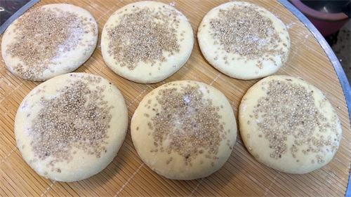将小面团擀成三厘米厚的薄片,表面抹上点水撒上芝麻,轻轻按压,让芝麻粘牢。把做好的馍放入烤箱,温度调到190度烤十五分钟,看着馍逐渐变得金黄酥脆,芝麻的香气弥漫在空气中,让人垂涎欲滴的自制烤馍就做好了。