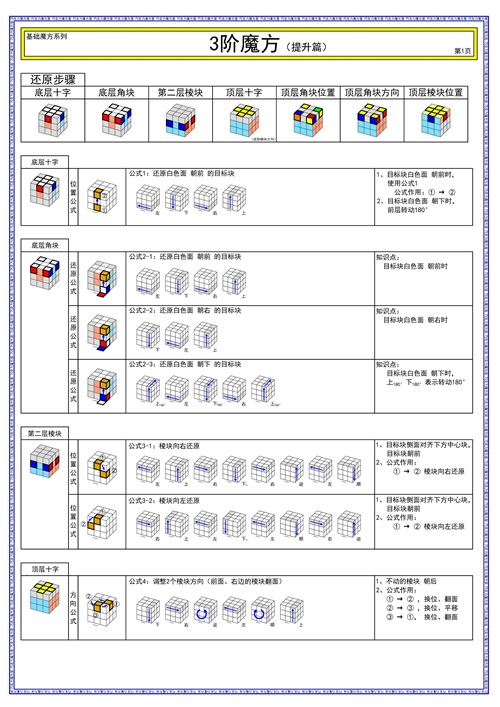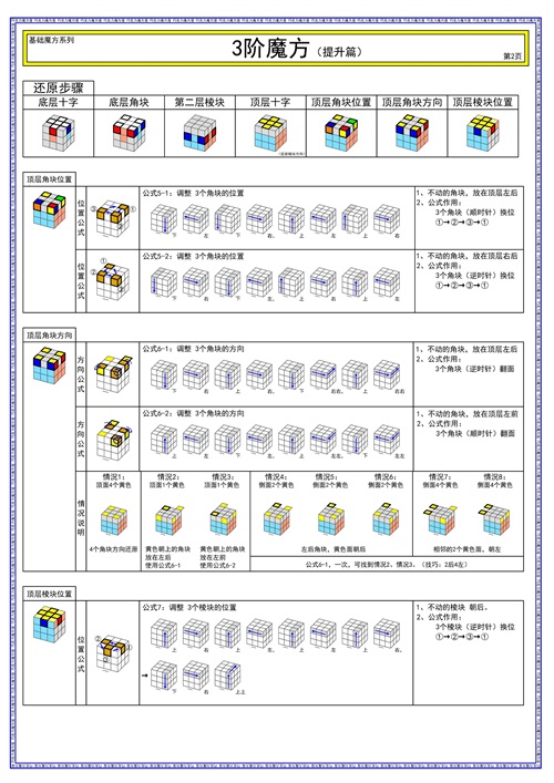这个还原顺序也是最常见的,主要用于三阶魔方,并不适用大部分的异形魔方。但,里面的公式口诀,对于还原更多不同的魔方有很大的帮助。建议学习。