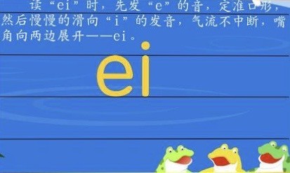 读 “ei "时,先发" e" 的音,定准口型,再慢慢的滑向"i" 的发音,气流不中断,嘴角向两边展开----ei.