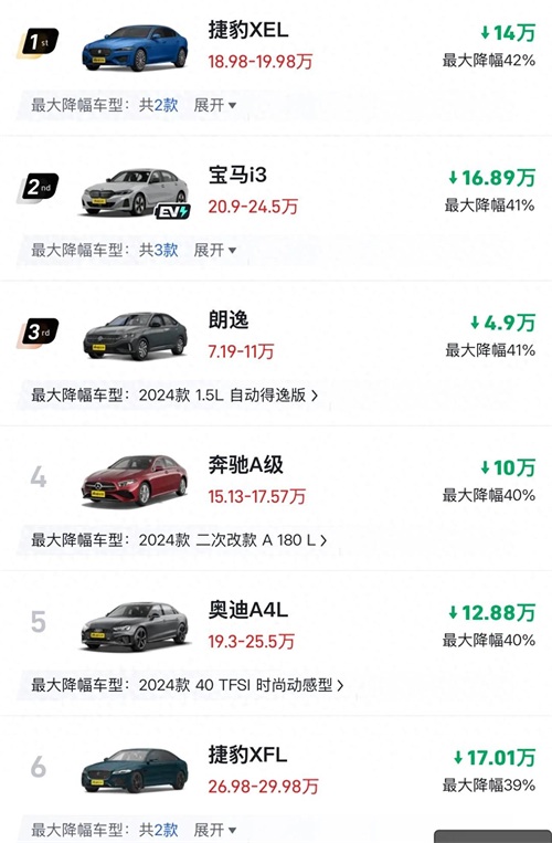 轿车降价幅度排行榜不出意外捷豹XEL降幅42%排名第一,宝马i3排名第二,大众朗逸排名第三,前两名捷豹占据2位。