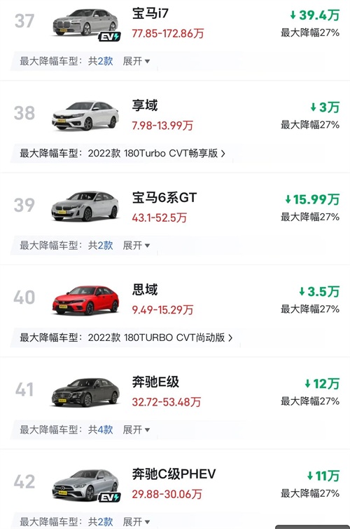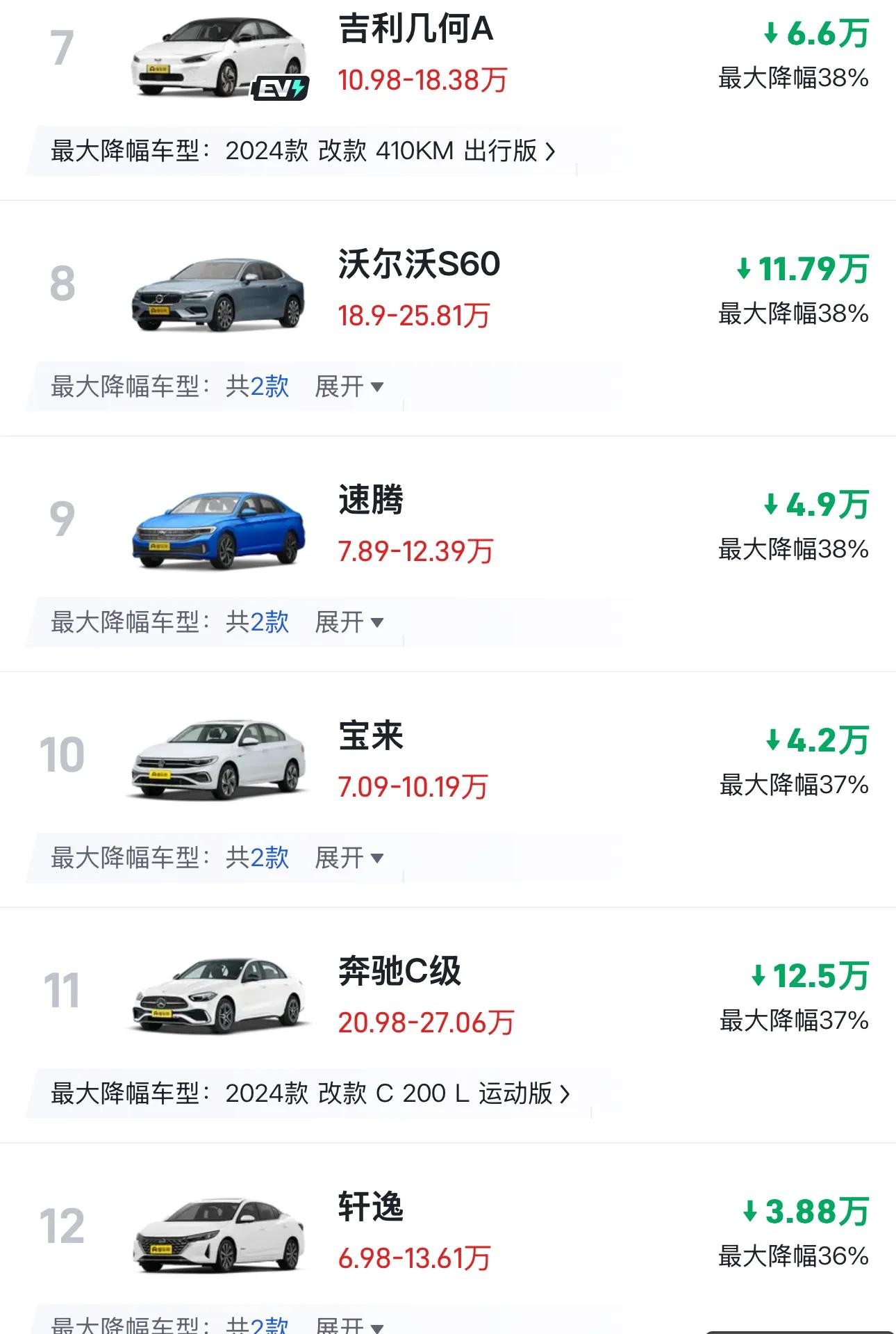 沃尔沃S60降幅38%,排名第八,奔驰C降幅37%,排名11
