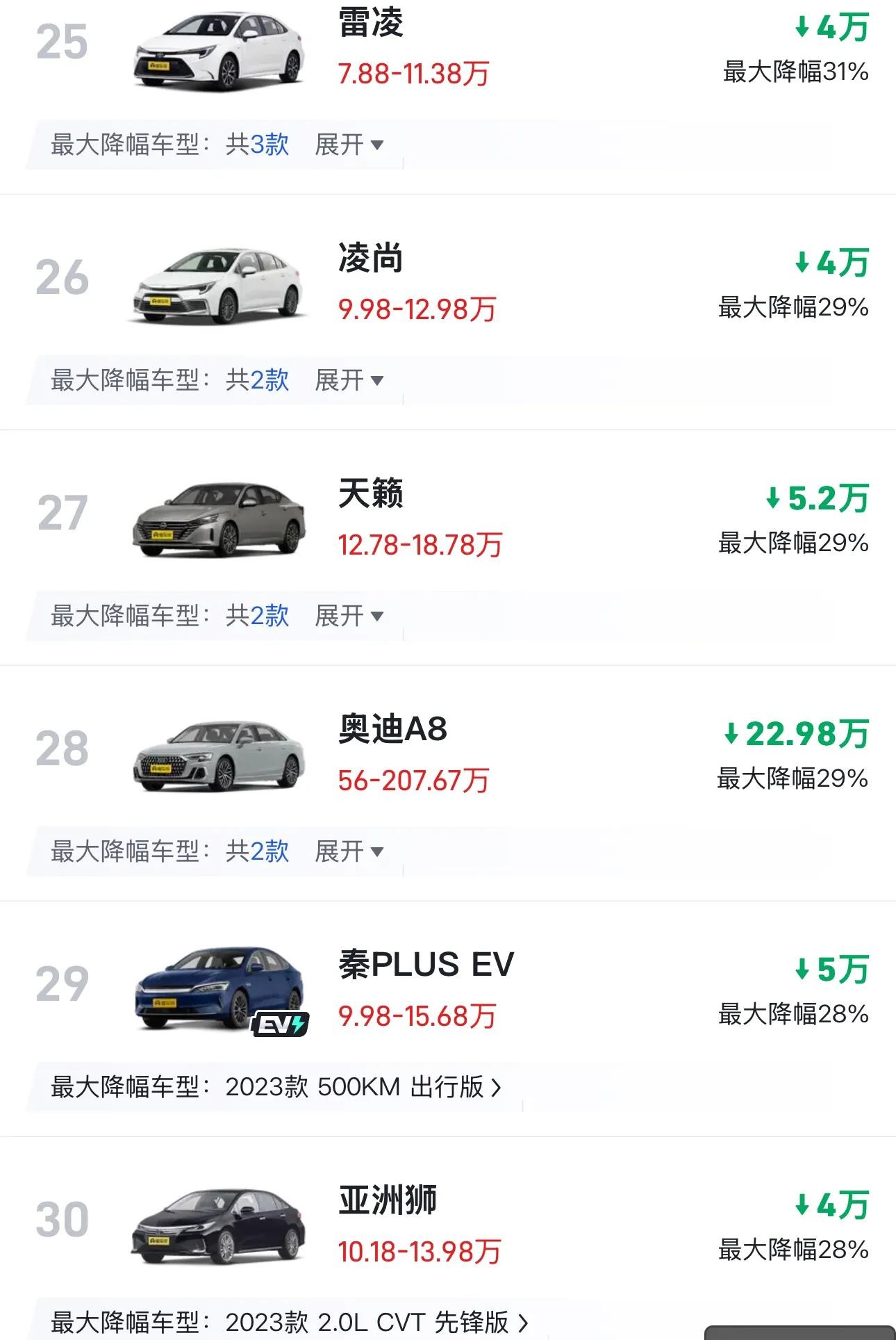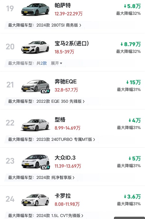 帕萨特降幅32%排名19,丰田卡罗拉降幅31%排名24