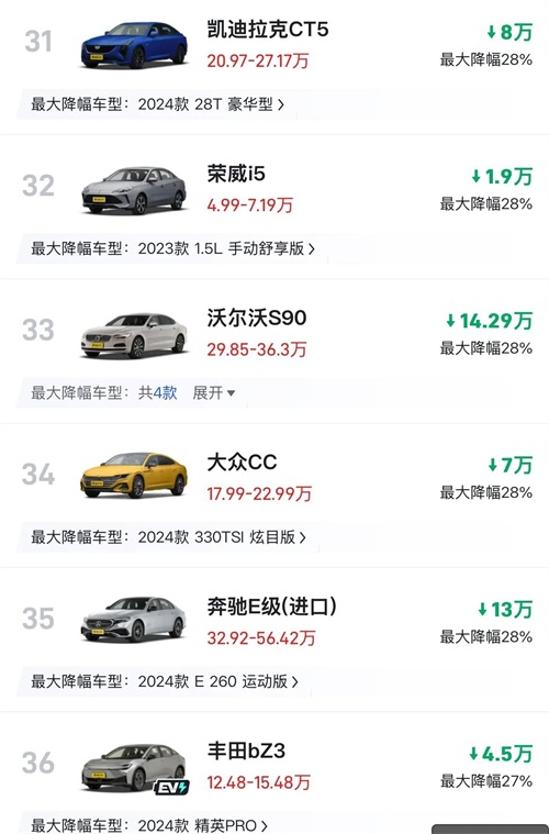 凯迪拉克CT5降幅28%排名31,奔驰E降幅28%排名35