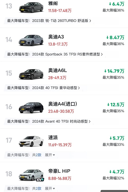 本田雅阁降幅36%,排名13,奥迪A6L降幅35%排名15