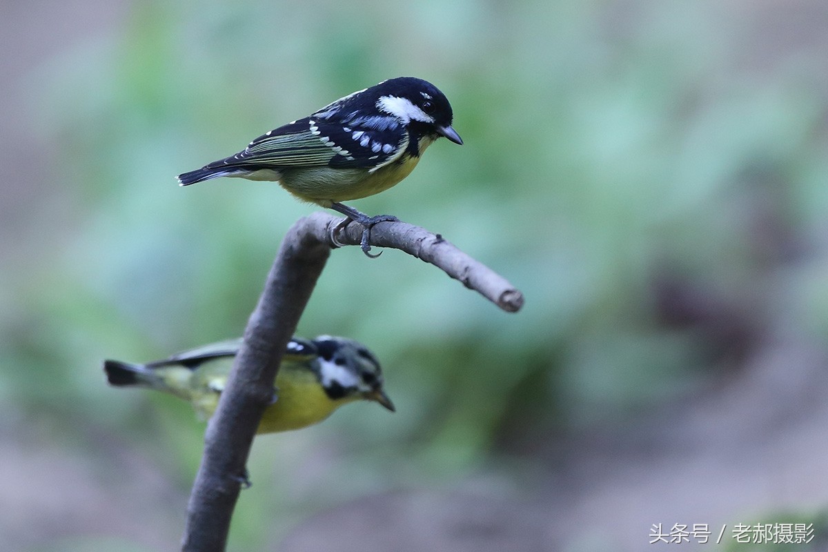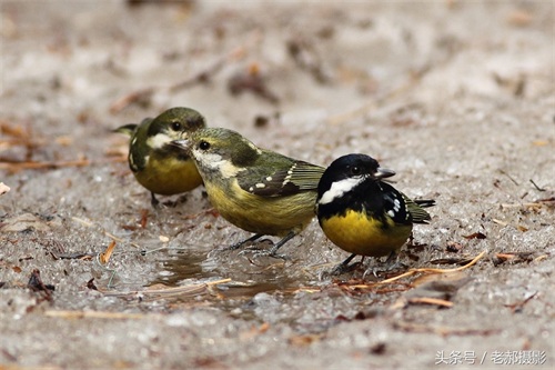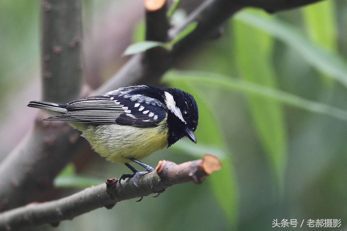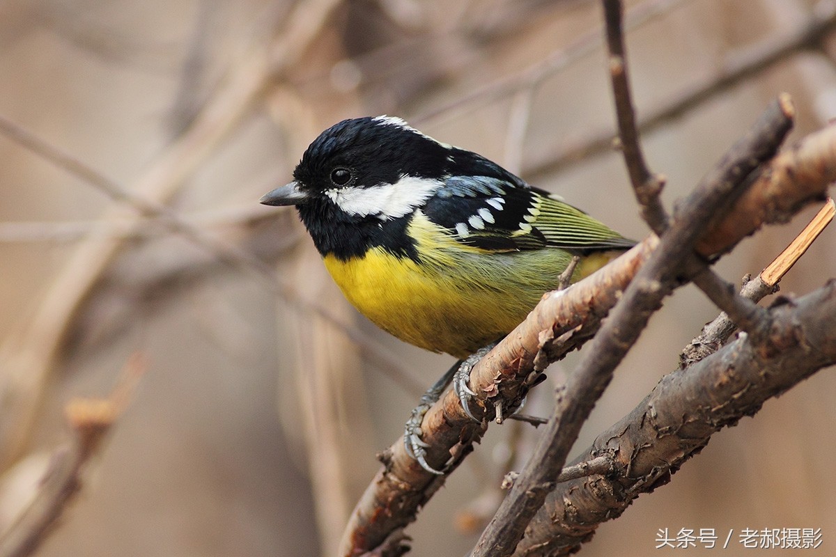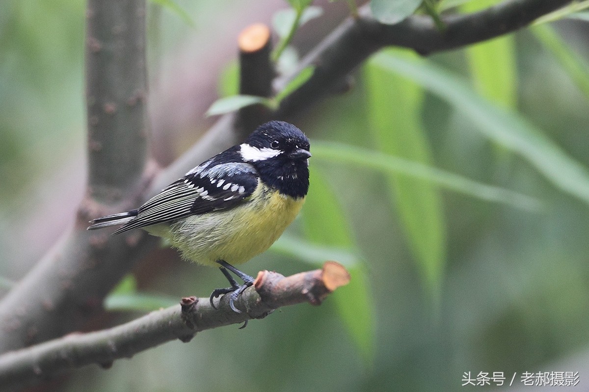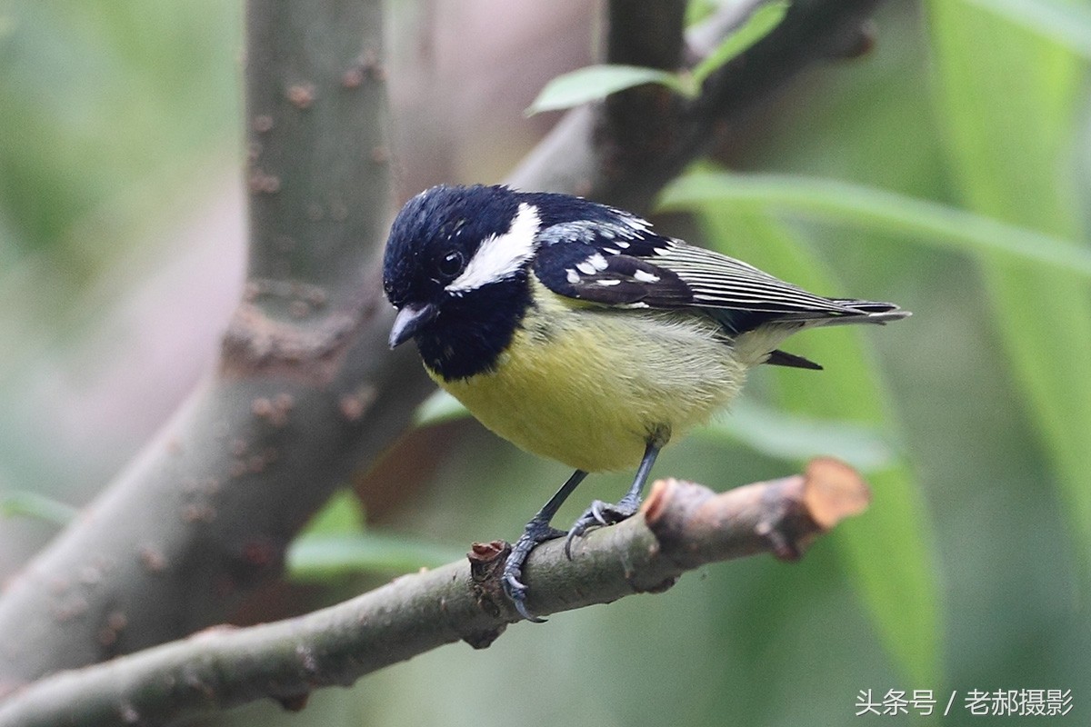 黄腹山雀雄鸟头和上背黑色,脸颊和后颈各具一白色块斑,在暗色的头部极为醒目。