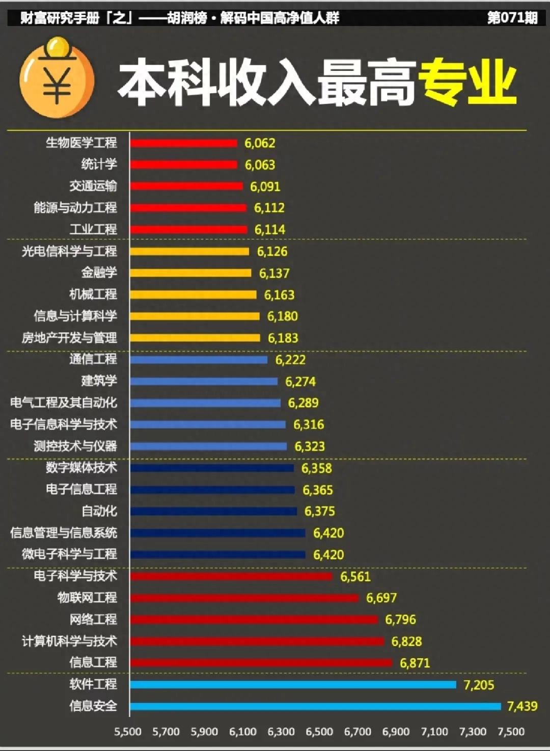 由上图也能看出,信息安全、软件工程、信息工程、计算机科学与技术、网络工程、物联网工程、电子科学与技术等专业排名靠前;交通运输、统计学、生物医学工程等专业相对靠后。